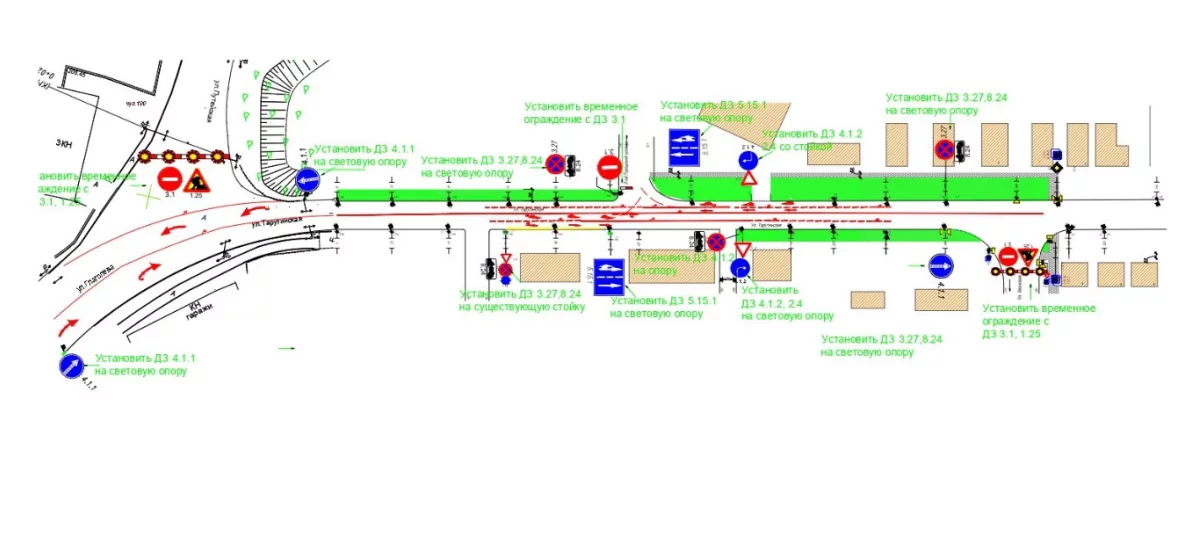 Чиновники пояснили, что это временная схема. Проехать можно будет только прямо между Тарутинской и Глаголева. Примыкания к улицам Путейской и Зерновой пока останутся закрыты.