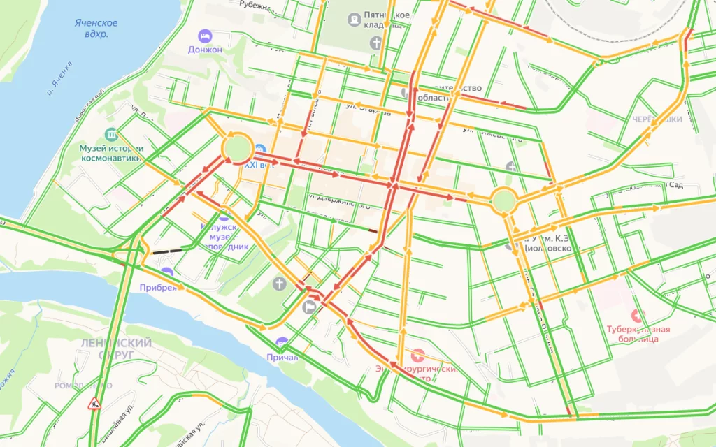 Трудно проехать по Кирова, Гагарина, Ленина, Московской, Кутузова, Либкнехта, Жукова, площади Старый Торг.
