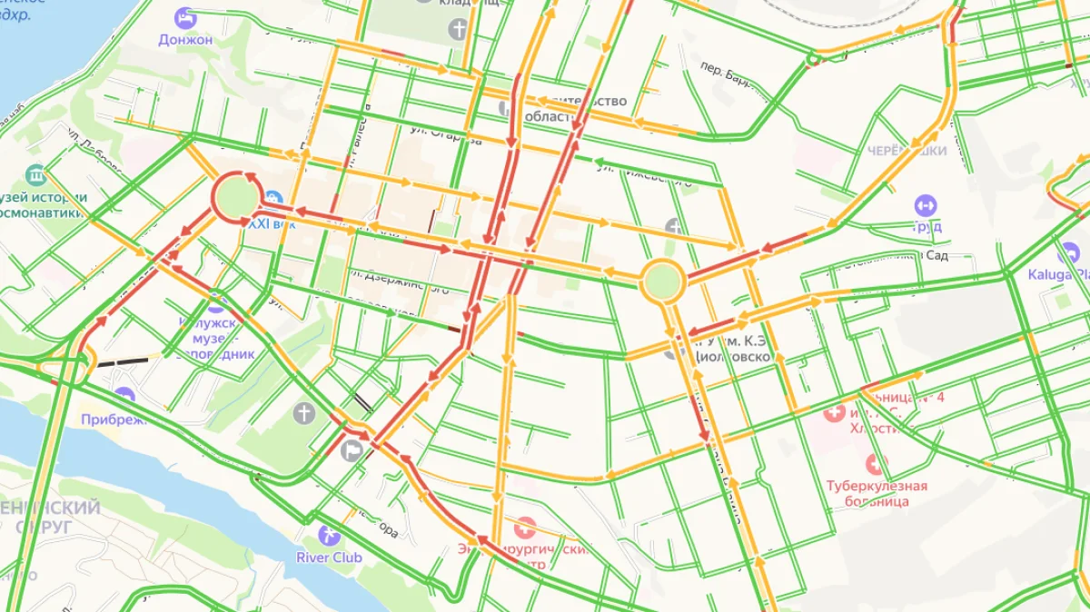 Заторы наблюдаются на улицах Кирова, Ленина, Московской, Гагарина, Королева, Кутузова, Жукова, Глаголева, площади Старый Торг.