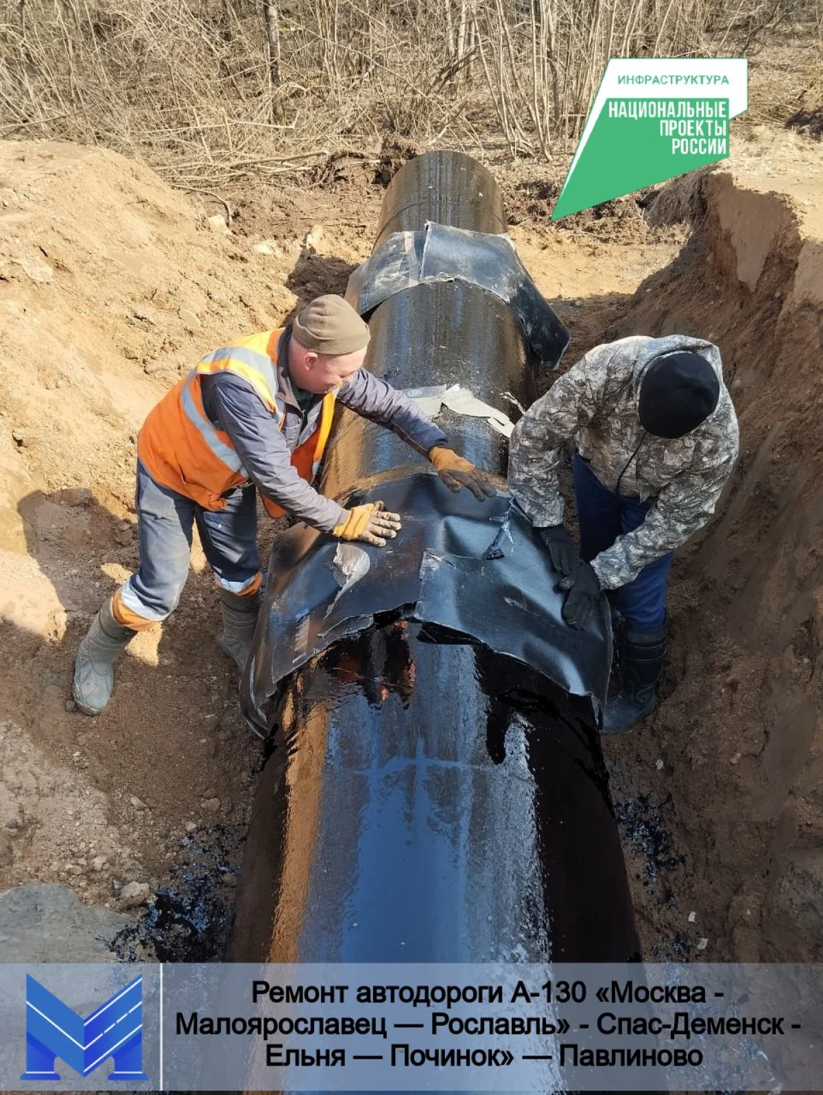 В рамках национального проекта «Инфраструктура для жизни» работы ведутся на дороге А-130 «Москва - Малоярославец — Рославль» - Спас-Деменск - Ельня - Починок» — Павлиново протяженностью 7300 метров.