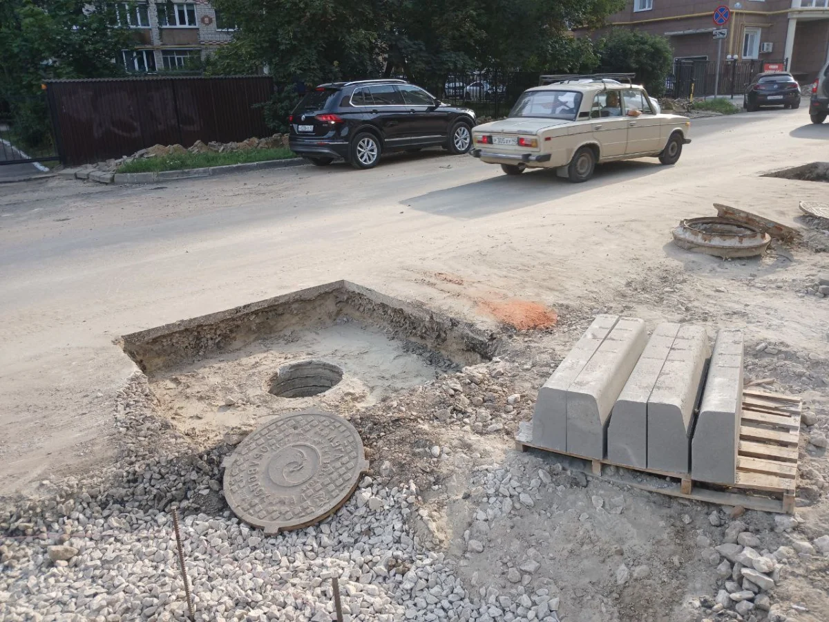 На прошлой неделе там уложили новый асфальт. Но теперь его разрезают вокруг канализационных колодцев, чтобы поднять их.