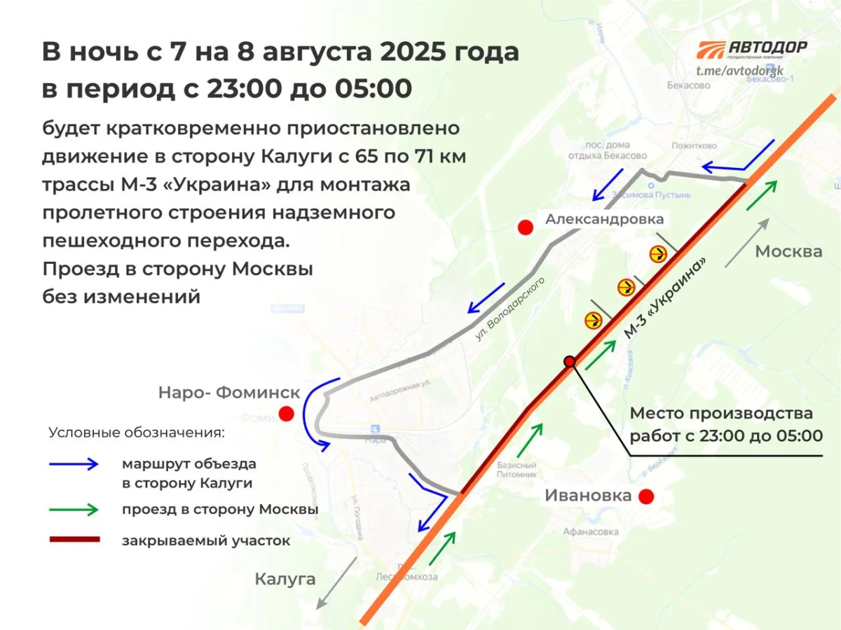 Ограничения из-за монтажа пролетного строения надземного пешеходного перехода введут на 70 километре дороги – недалеко от границы с Калужской областью.