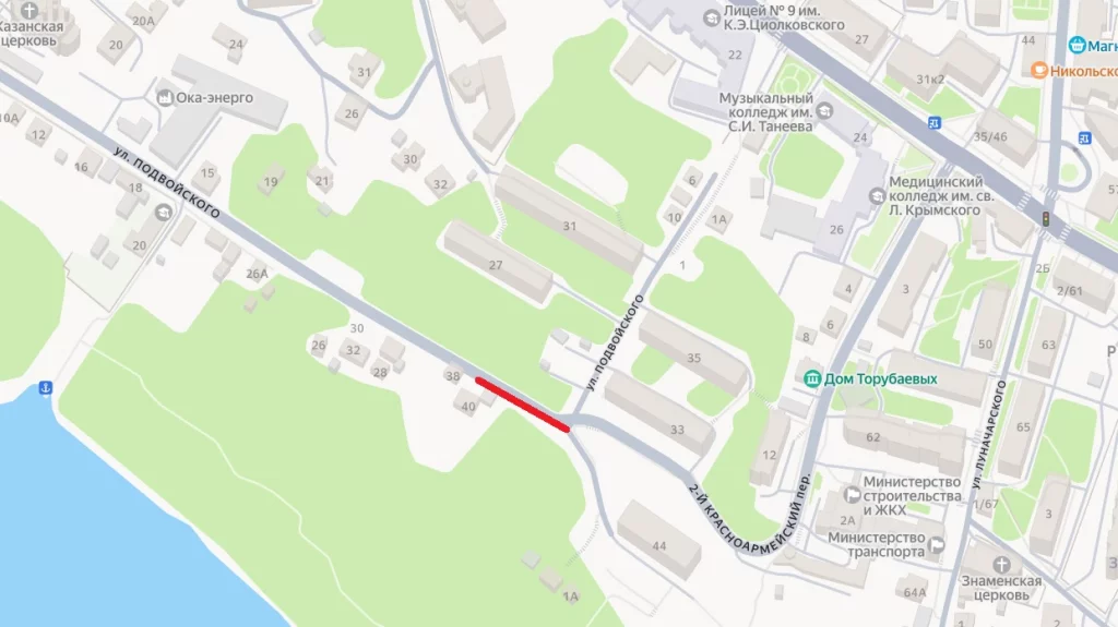 Движение транспорта на участке от дома №40 до 2-го Красноармейского переулка организовано по одной полосе.