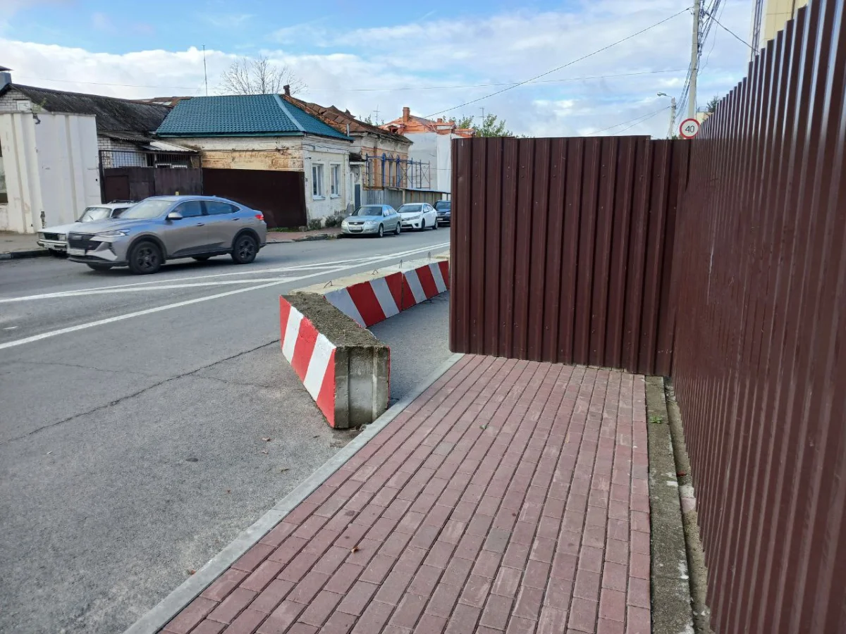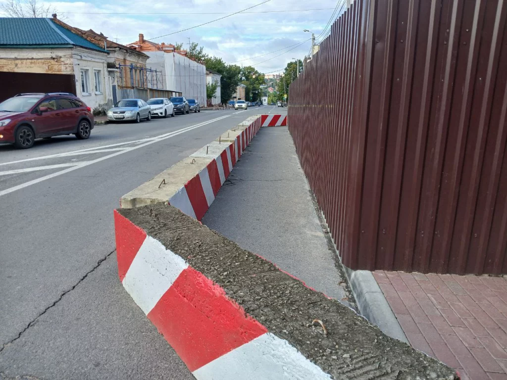 Часть асфальта огорожена бетонными блоками рядом с местом реконструкции церкви.