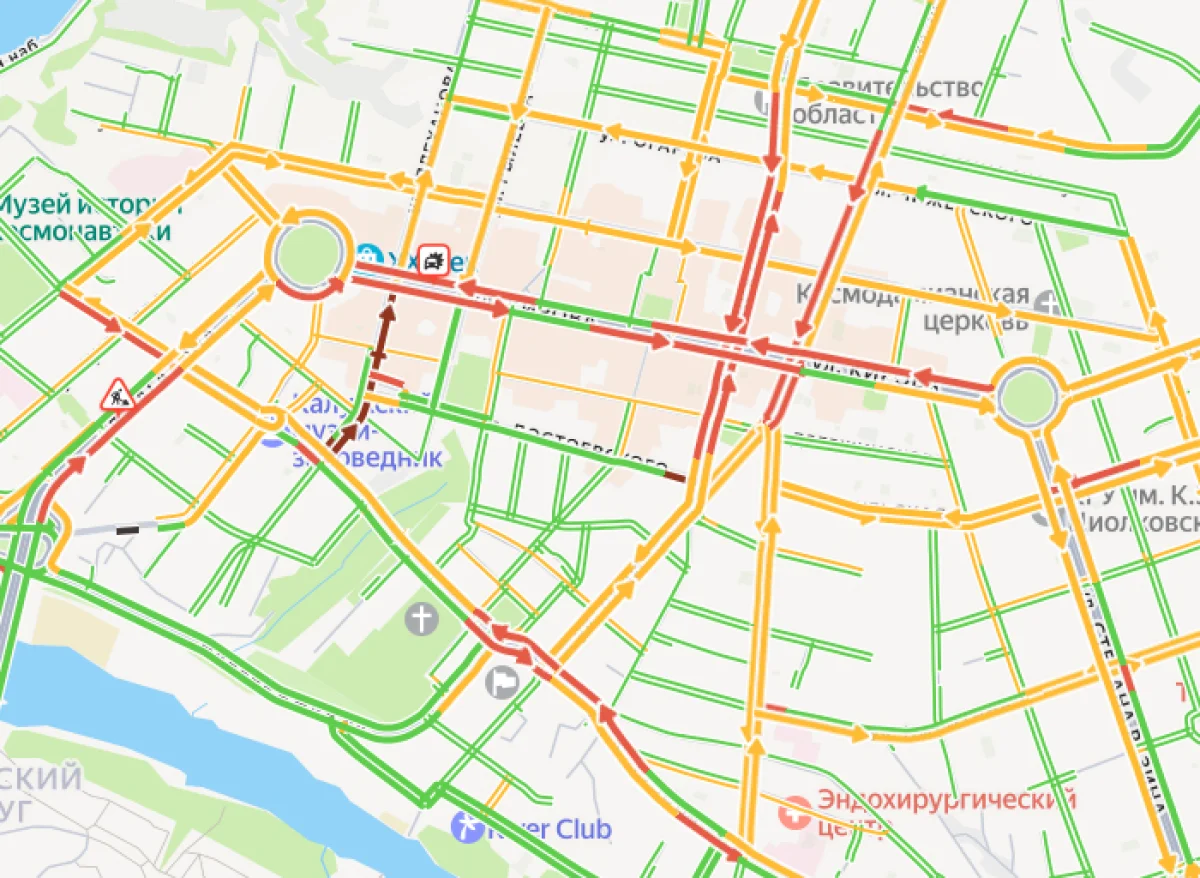 Заторы уже наблюдаются на улицах Кирова, Кутузова, Ленина, Московской, Плеханова, Гагарина.