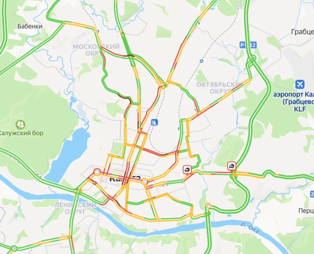 В пробках стоят улицы Кутузова, Набережная, Гагарина, Кирова, Тульская, Жукова, Ленина, Московская, Тарутинская, Путейская, Железняки и другие.