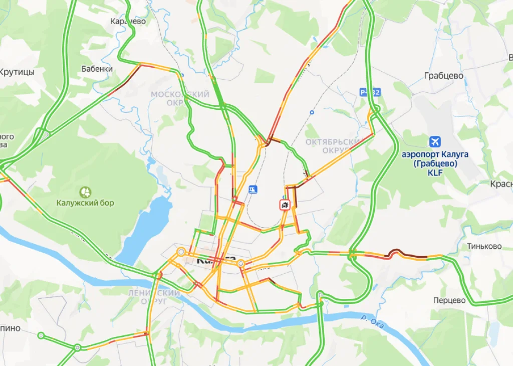 В пробках стоят улицы Советская, Генерала Попова, Тарутинская, Московская, Телевизионная, Жукова, Тульская, Никитина, Кутузова, Широкая, Грабцевское шоссе, дорога между Белой и Силикатным, подъездная дорога от трассы М3 «Украина».