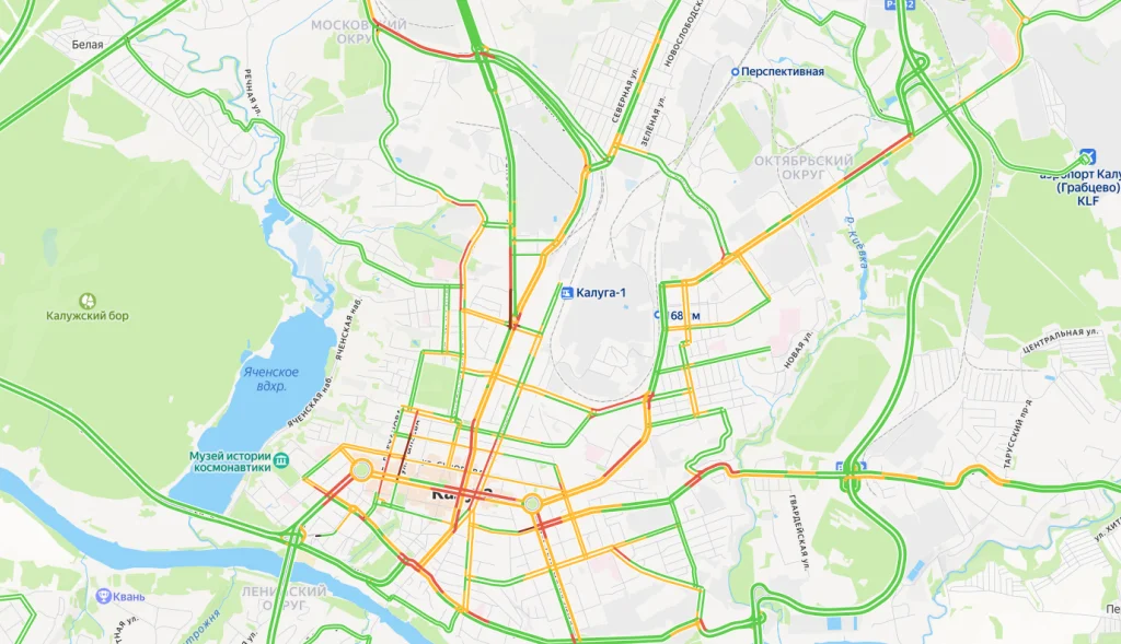 Пробки наблюдаются на Грабцевском шоссе, улицах Кутузова, Гагарина, Кирова, Плеханова, Московской, Ленина, Жукова, Путейской, Тарутинской, Телевизионной.