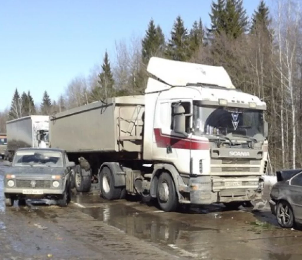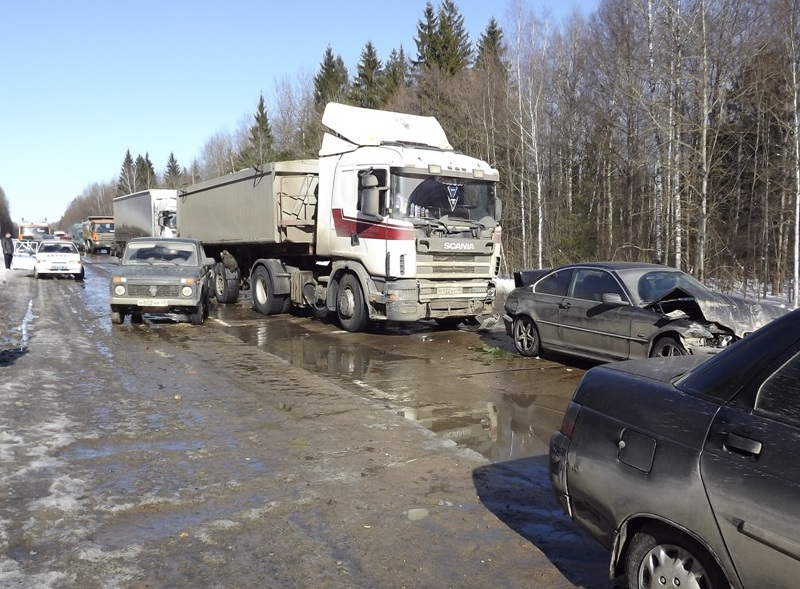 Водитель грузовика Scania с полуприцепом врезался в стоящую впереди BMW 323. «БМВ» по инерции столкнулся с «Нивой», которая пыталась съехать на обочину, и Renault Logan. «Нива» в свою очередь врезалась в ВАЗ 21101, который также пытался в момент аварии съехать с дороги.