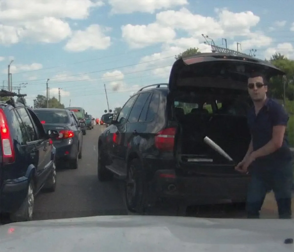 Что именно происходило дальше, понять по видео невозможно - запись звука в регистраторе была отключена. Но спустя несколько секунд парни из BMW вернулись к своей машине и достали из багажника биты. Один из них из салона вернулся с предметом, похожим на пистолет.
