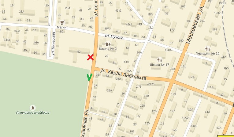 Красным отмечено место, где остановка располагается сейчас. Зеленым - куда будет перенесена в ближайшие дни.