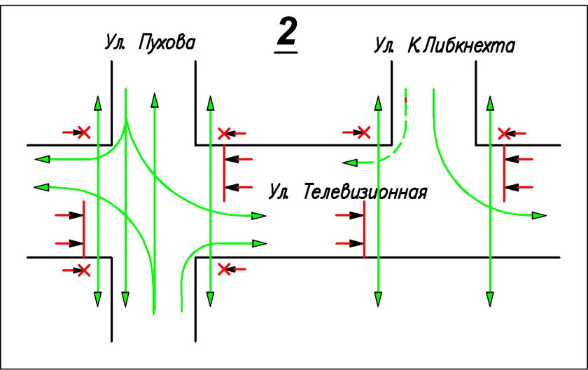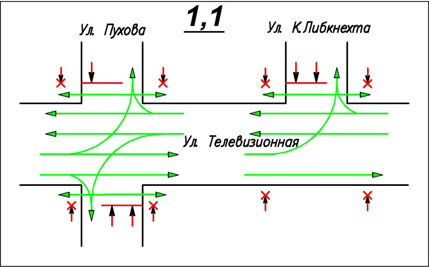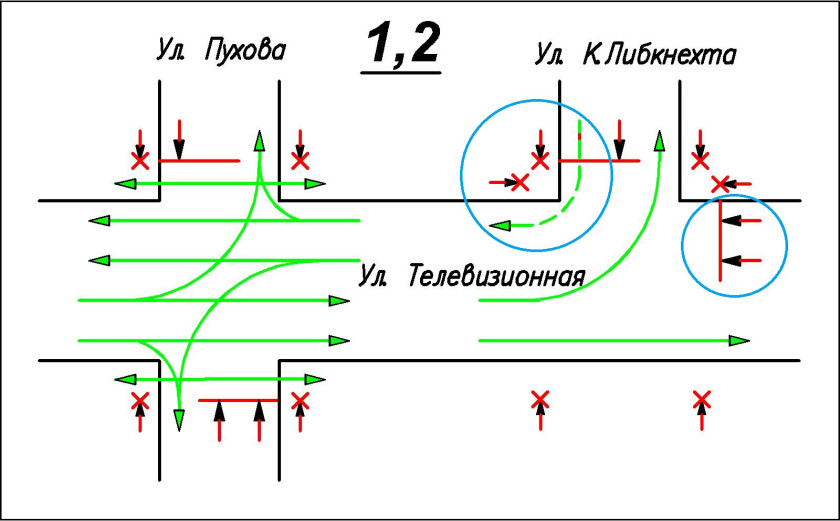 На схемах 1.1 и 2 представлена нынешняя схема движения на этих перекрестках: