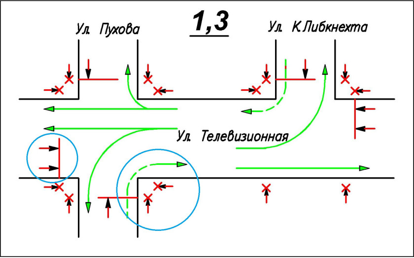 На схеме 1.3: вводится режим «отсечки», происходит включение красного сигнала светофора для автотранспорта, двигающегося по ул. Телевизионной со стороны ул. Билибина, и включение правой дополнительной секции светофора (стрелки), разрешающий поворот направо с ул. Пухова. В этот период времени движение пешеходов на всех перекрестках запрещено.