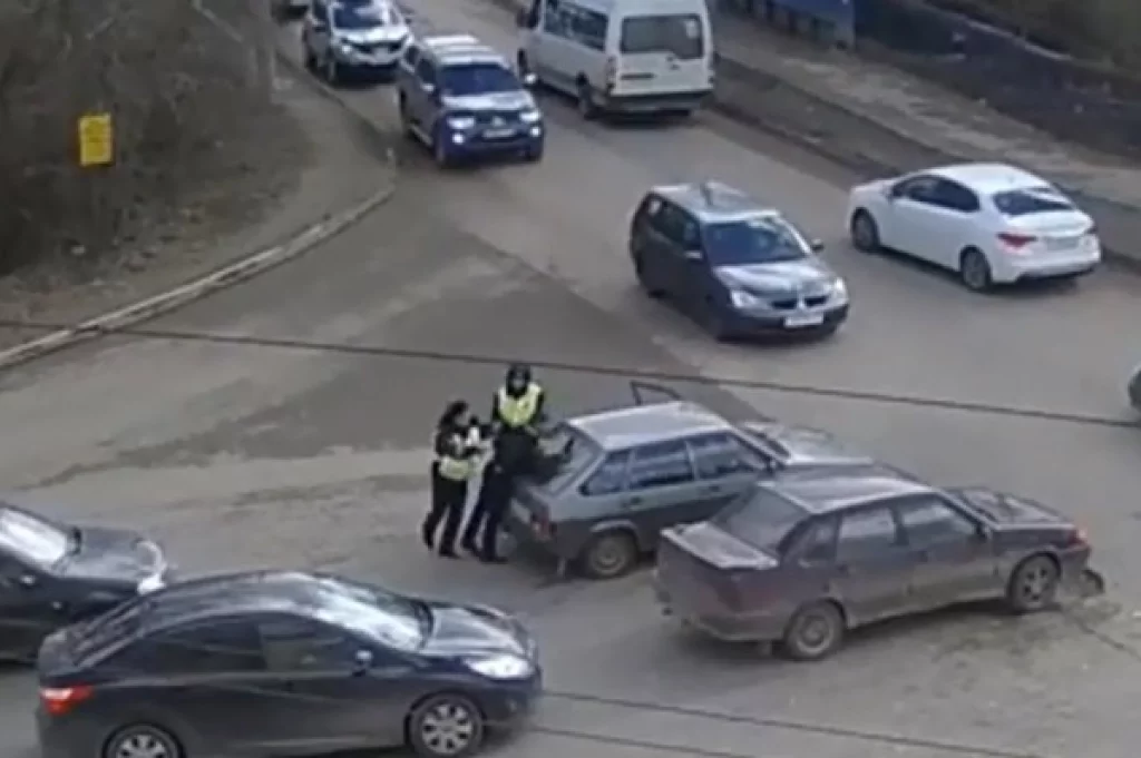 Утром в четверг, 9 апреля, на Синих мостах в Калуге сотрудники ДПС остановили для проверки автомобиль «Лада». Инцидент попал на запись камеры видеонаблюдения.