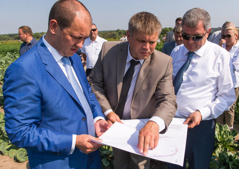 Первый замгубернатора Алексей Лаптев, министр дорожного хозяйства региона Андрей Белозеров и врио губернатора Анатолий Артамонов.