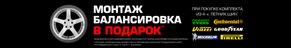 Любому покупателю приятно, когда к покупке прилагается дополнительный бесплатный «бонус». И у серьезного продавца, как правило, всегда найдется что-то особенное, когда речь идет о крупной покупке. В «Колеса Даром» таким предложением является «Монтаж и балансировка в подарок». В новом сезоне эта услуга предоставляется бесплатно всем покупателям, которые приобретают летние шины Pirelli, Nokian, Michelin, Continental, Goodyear или Viatti комплектом от 4 штук, а воспользоваться ею можно в шинных центрах «Колеса Даром» в удобное время. И если уж говорить о шиномонтажных услугах до конца, то стоит отметить еще один сервис от компании «Колеса Даром», встречающийся на рынке крайне редко. Это «онлайн-запись на шиномонтаж», воспользоваться которой может любой зарегистрированный пользователь сайта kolesa-darom.ru.