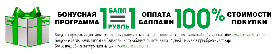 Следующая резонная причина остановить свой выбор на kolesa-darom.ru – это бонусная программа онлайн-магазина. За покупки, совершенные на сайте, всем зарегистрированным пользователям начисляются бонусные баллы. Возможно, сейчас этим мало кого удивишь, но то, что этими бонусами покупатель может оплачивать 100 % стоимости следующих покупок, является беспрецедентным предложением!