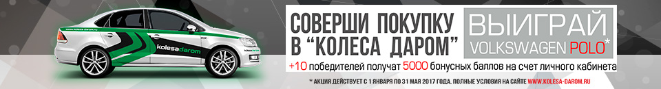 Ну и напоследок нельзя не сказать о промо-акциях, проводимых компанией «Колеса Даром». На наш взгляд она намного опережает своих конкурентов в этом отношении. На данный момент в торговой сети действует более 10 различных спецпредложений, венчает которые самая выдающаяся акция, подготовленная специально к летнему сезону – «Соверши покупку в Колеса Даром – выиграй Volkswagen Polo»! Напомним, что это уже четвертый автомобиль, разыгрываемый среди покупателей за последние два года. И в этот раз компания предлагает его выиграть абсолютно любому покупателю, приобретающему не только шины или диски. Для участия в акции достаточно оформить любую покупку на сумму от 5000 рублей.