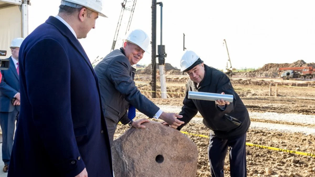 Символическую капсулу с посланием потомкам на месте строительства новой школы заложили почётные гости - губернатор Калужской области Анатолий Артамонов, министр архитектуры и строительства Республики Беларусь Анатолий Чёрный и руководитель проекта «Веснушки» Андрей Сокол. Торжественная церемония проходила на фоне работающей техники - строительство не должно останавливаться.