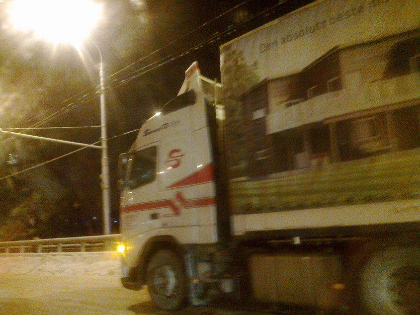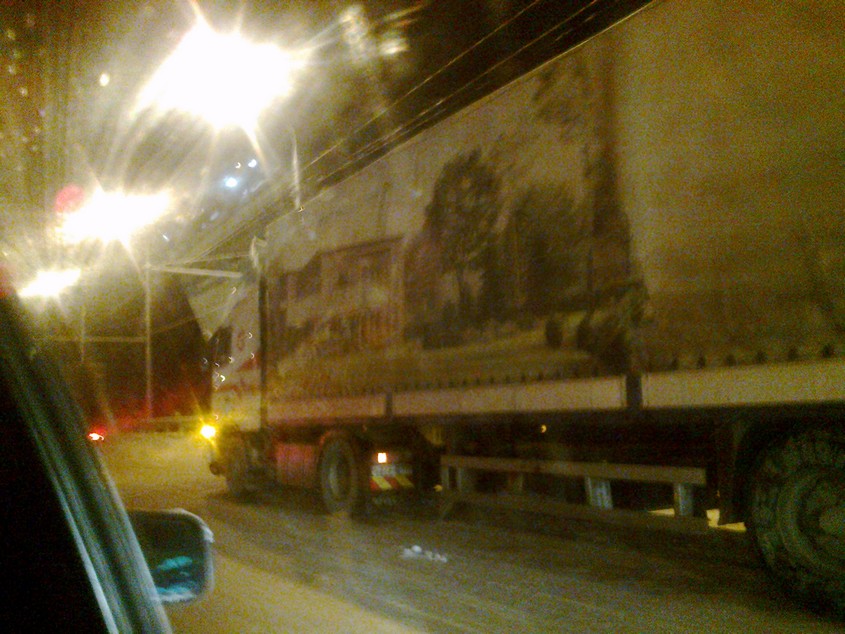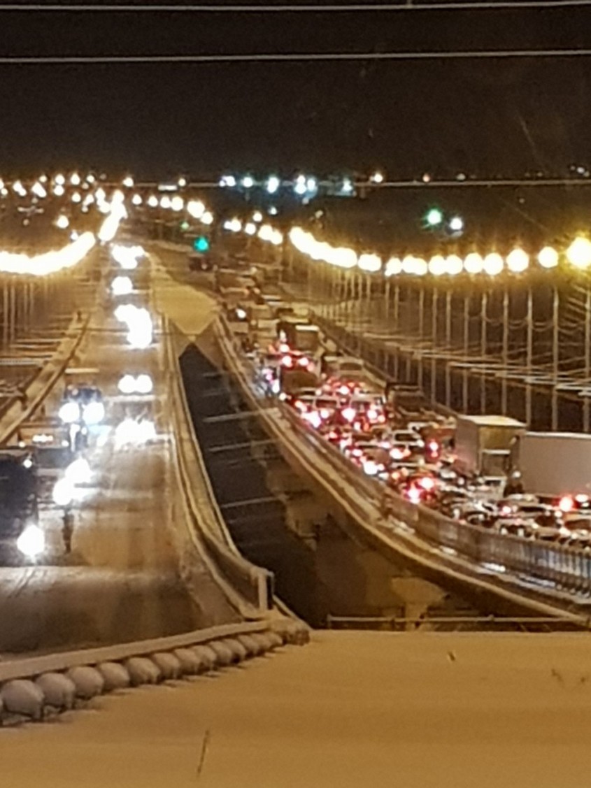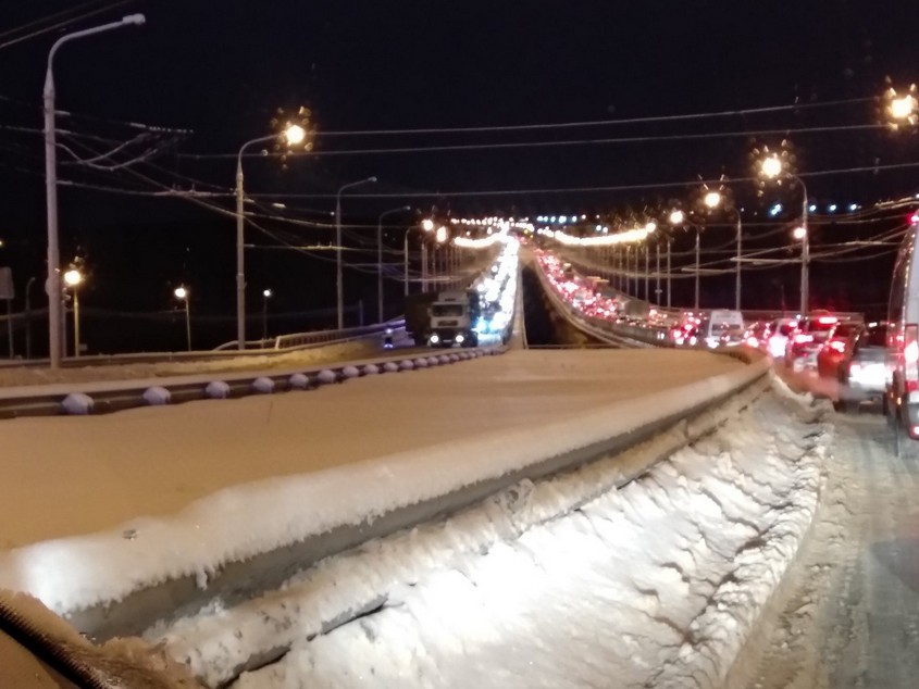 В какой-то момент движение немного активизировалось, и до середины моста мы доехали относительно быстро – нашему водителю удалось развить скорость аж до 10 км/ч. Но наша радость оказалась преждевременной: на середине дороги транспорт снова встал. Возобновилось движение минут через 10-15. Автомобили ехали очень медленно, осторожно огибая ещё несколько буксовавших фур.