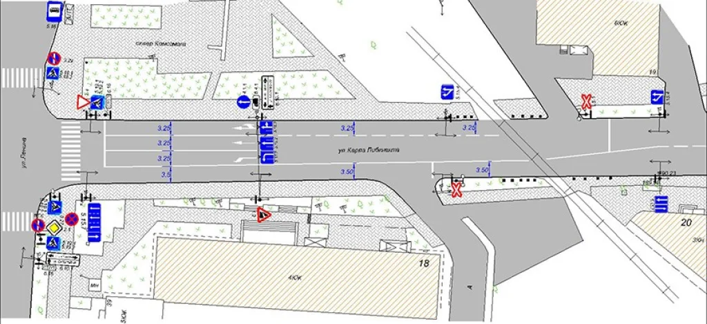 Новая схема предусматривает увеличение количества полос движения по Карла Либкнехта со стороны Веры Андриановой до трех. По крайней правой можно будет ехать прямо и направо, по средней – прямо, по крайней левой – налево.