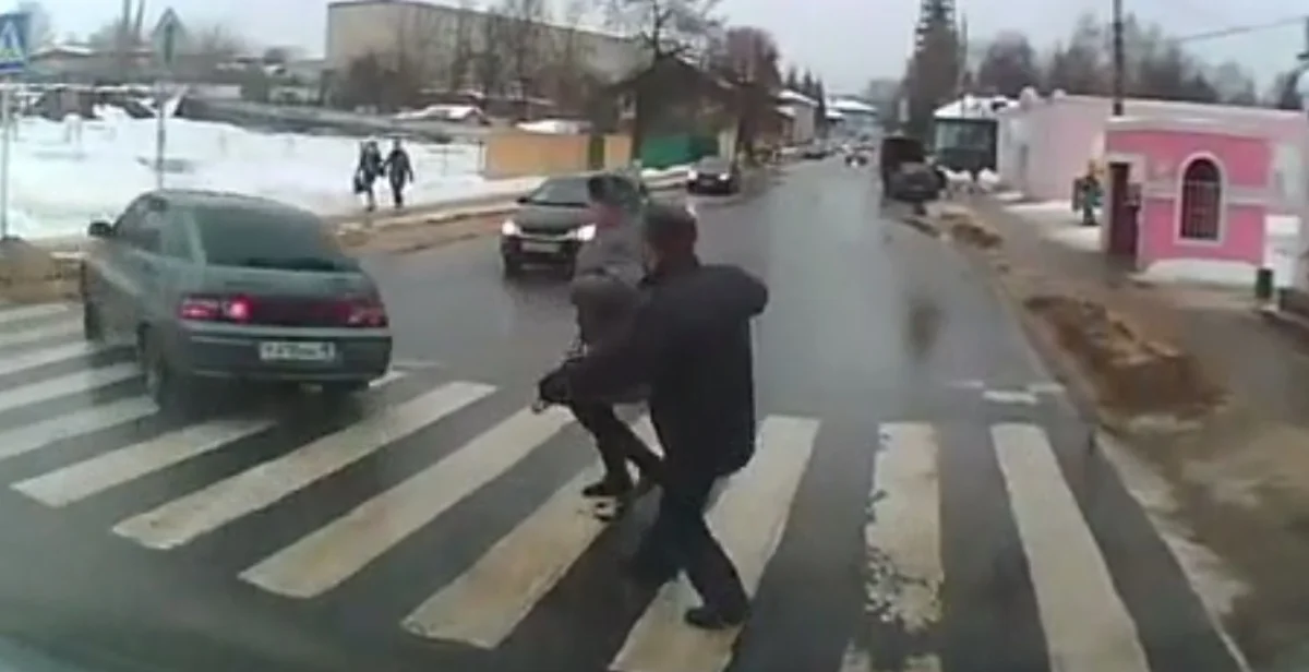 Если судить по видео, лихач на «Ладе» слишком поздно начал тормозить перед переходом, по которому уже шли мужчина и женщина. Машину занесло, и она вылетела на тротуар, где шли двое детей. Каким-то чудом никто в этой ситуации не пострадал.