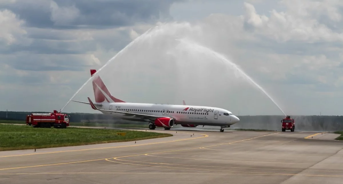В этом году первый самолет улетел 3 июня в 14:30. В калужском аэропорту борт встречала эффектная водяная арка, подготовленная противопожарной службой аэропорта.