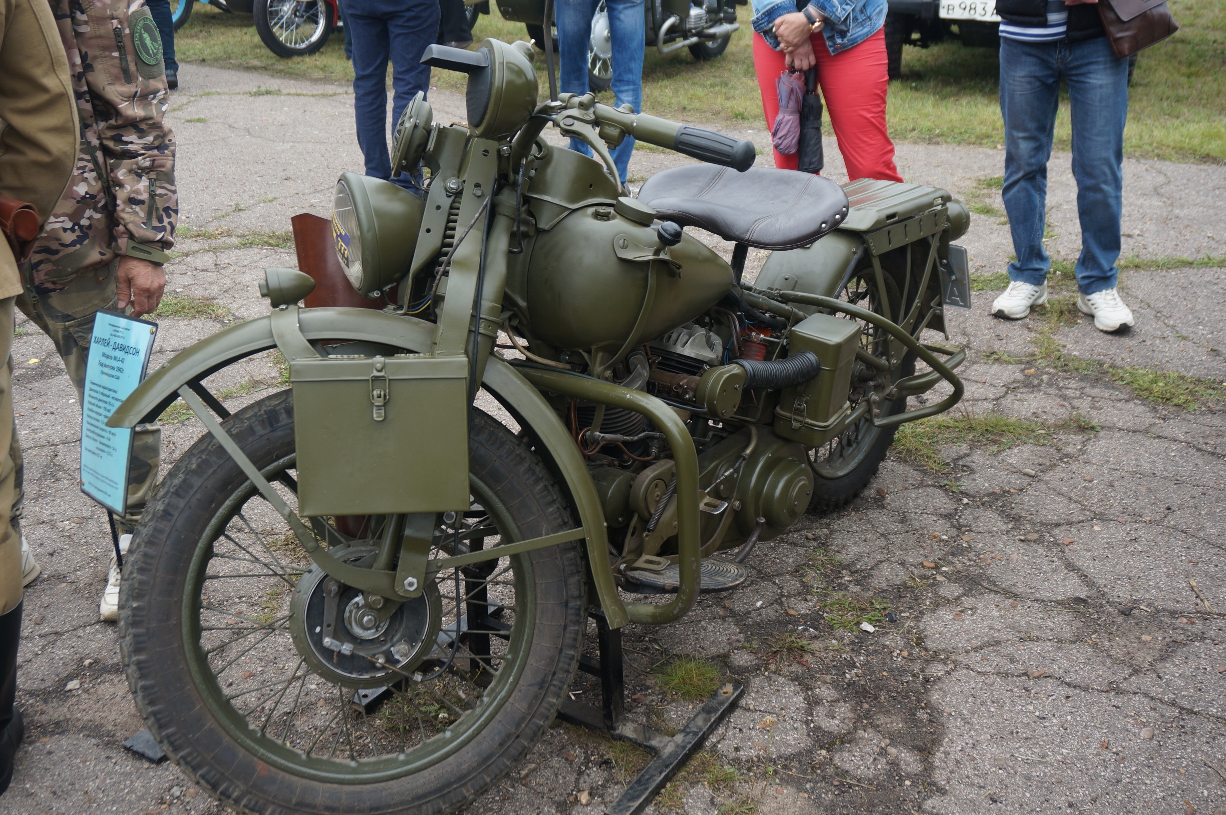 Американский мотоцикл Harley-Davidson 1942 года. Максимальная скорость - 99 км/ч. Армейская модель выпускалась в годы Второй мировой войны. Американцы поставили в СССР по ленд-лизу 30 тысяч таких аппаратов. Данный экземпляр восстановили в 2017 году.