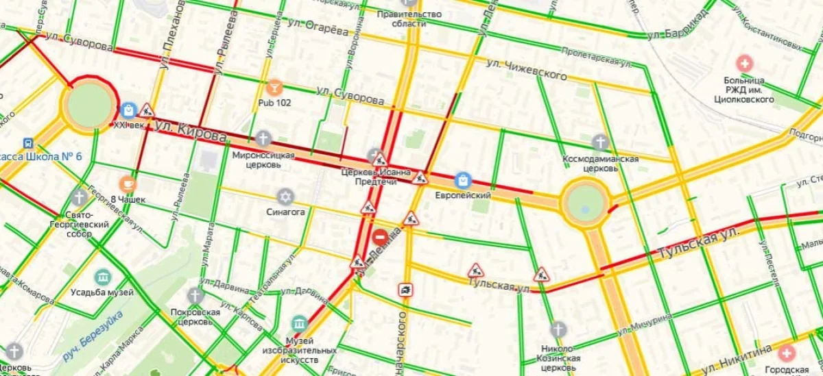 А по центру города многие калужане города предпочли передвигаться пешком. Сервис Яндек.Пробки окрасил красным всю Кирова и прилегающие улицы.