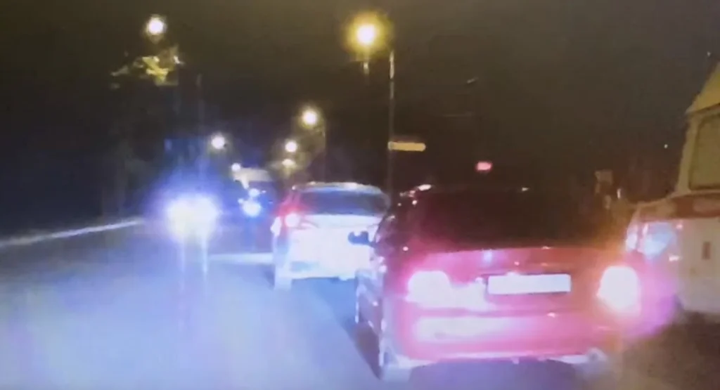 Судя по этой записи, водитель с регистратором ехал по левой полосе, а лихач – по правой. Когда в правой полосе начала притормаживать машина скорой помощи, водитель красной легковушки резко перестроился влево, а потом вправо, подрезав автора видео. И тут же лихача остановили инспекторы ДПС.