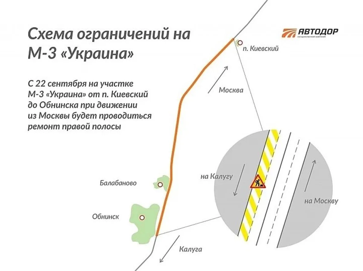 Пока идут ремонтные работы, с 65-го по 106-й километр автомобили пустят только по левой полосе. В населенных пунктах, которые находятся на этом отрезке – от поселка Киевский до Обнинска – скоростной режим будет ограничен до 40 км/ч. За их пределами до 50 км/ч.