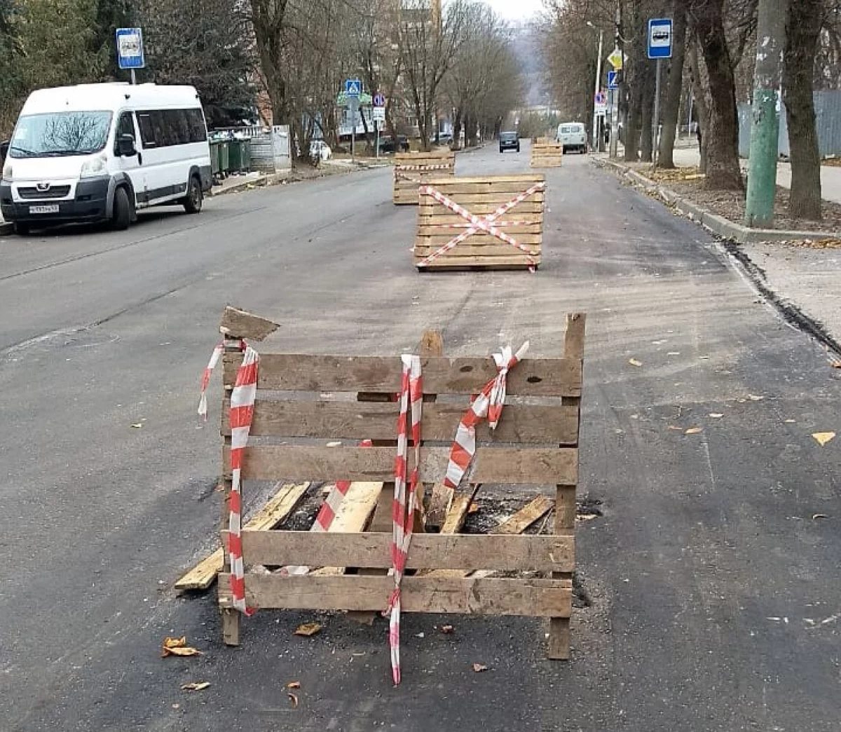 Вечером во вторник, 17 ноября, на улице Циолковского убрали ограждение вокруг открытых колодцев. Это было сделано, чтобы подрядчик смог уложить нижний слой асфальта. Днем 18 ноября ограждение вновь установили.