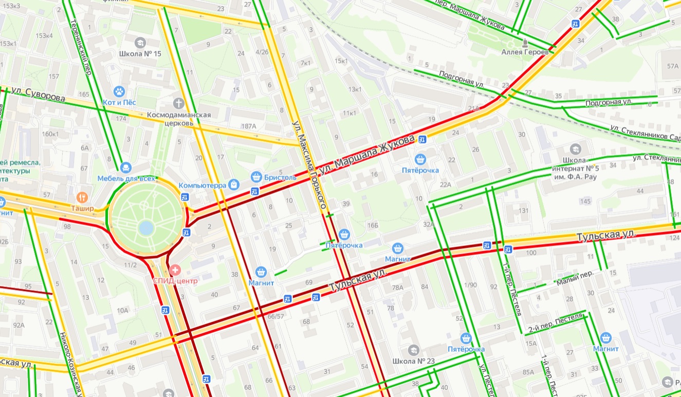 Пробки образовались на центральных улицах: Кирова, Ленина, Московской, Кутузова, Королева, Гагарина, Плеханова, Рылеева, Степана Разина, Тульской. Также с трудом можно проехать по Жукова, Грабцевскому шоссе, Гурьянова, Киевскому проезду, Глаголева в районе Синих мостов.
