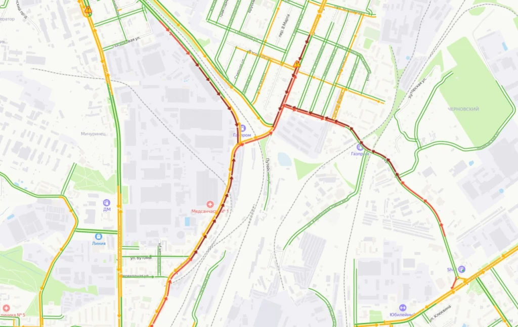 Огромные пробки образовались на улицах Глаголева, Тарутинской, Путейской и Зерновой.