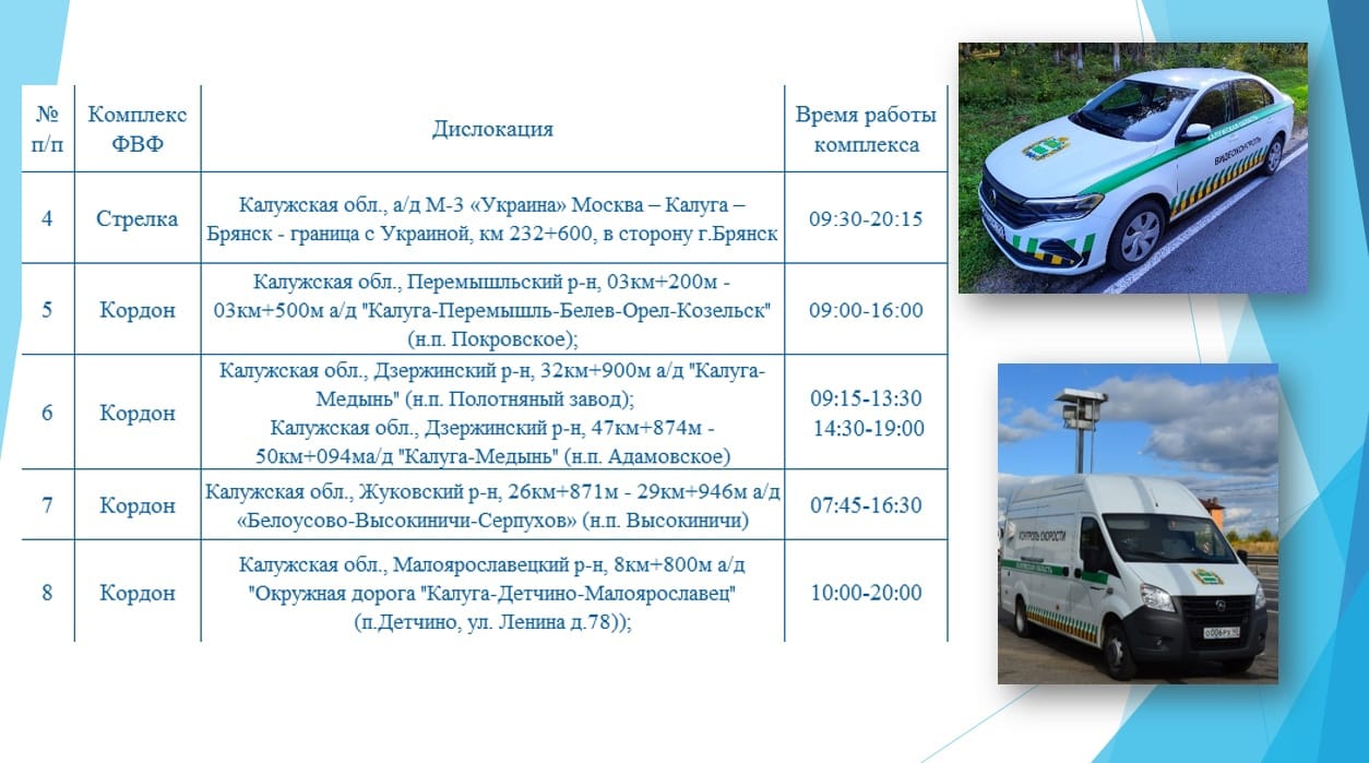 В области видео и фото фиксация проходит на трассе М-3 «Украина», в Малоярославецком, Дзержинском, Перемышльском и Жуковском районах. Более точные адреса – в таблице ниже.