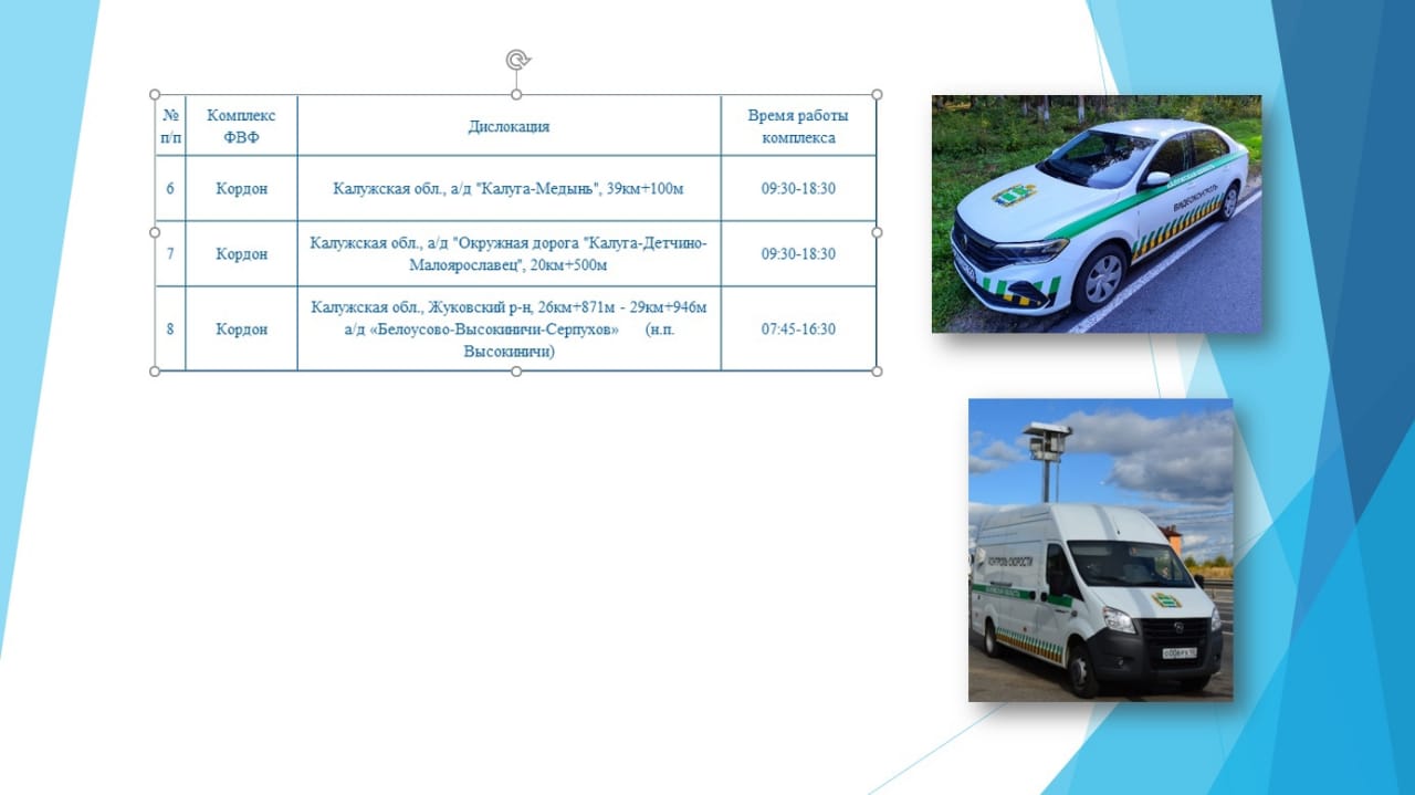 В области видео и фотофиксация проходит на окружной дороге «Калуга – Детчино - Малоярославец», на трассе М3 «Украина», на дороге «Калуга-Медынь», а также в Бабынинском и Жуковском районах.