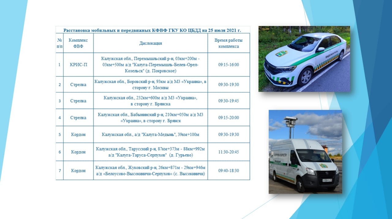 В области видео и фотофиксация проходит на трассе М-3 «Украина», на дороге Калуга - Медынь, а также в Перемышльском, Боровском, Тарусском, Бабынинском и Жуковском районах.