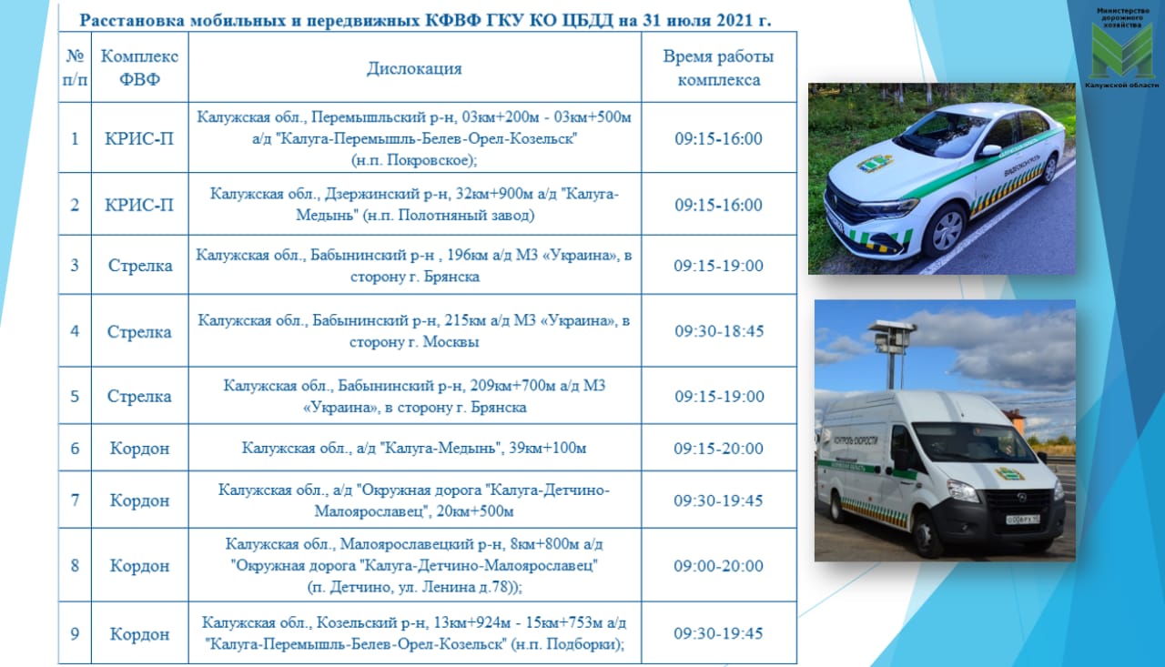 В области видео и фото фиксация проходит на трассе М3 «Украина», на а/д «Окружная дорога «Калуга-Детчино-Малоярославец», на а/д «Калуга-Медынь», а также в Перемышльском, Дзержинском, Козельском, Малоярославецком и Бабынинском районах.
