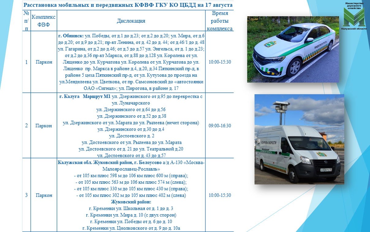 Во вторник, 17 августа, по данным «Центра безопасного дорожного движения», мобильные и передвижные камеры в Калуге можно будет встретить с 9:00 до 16:30.