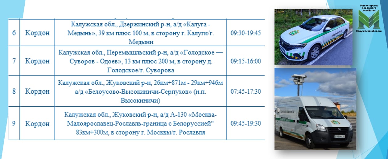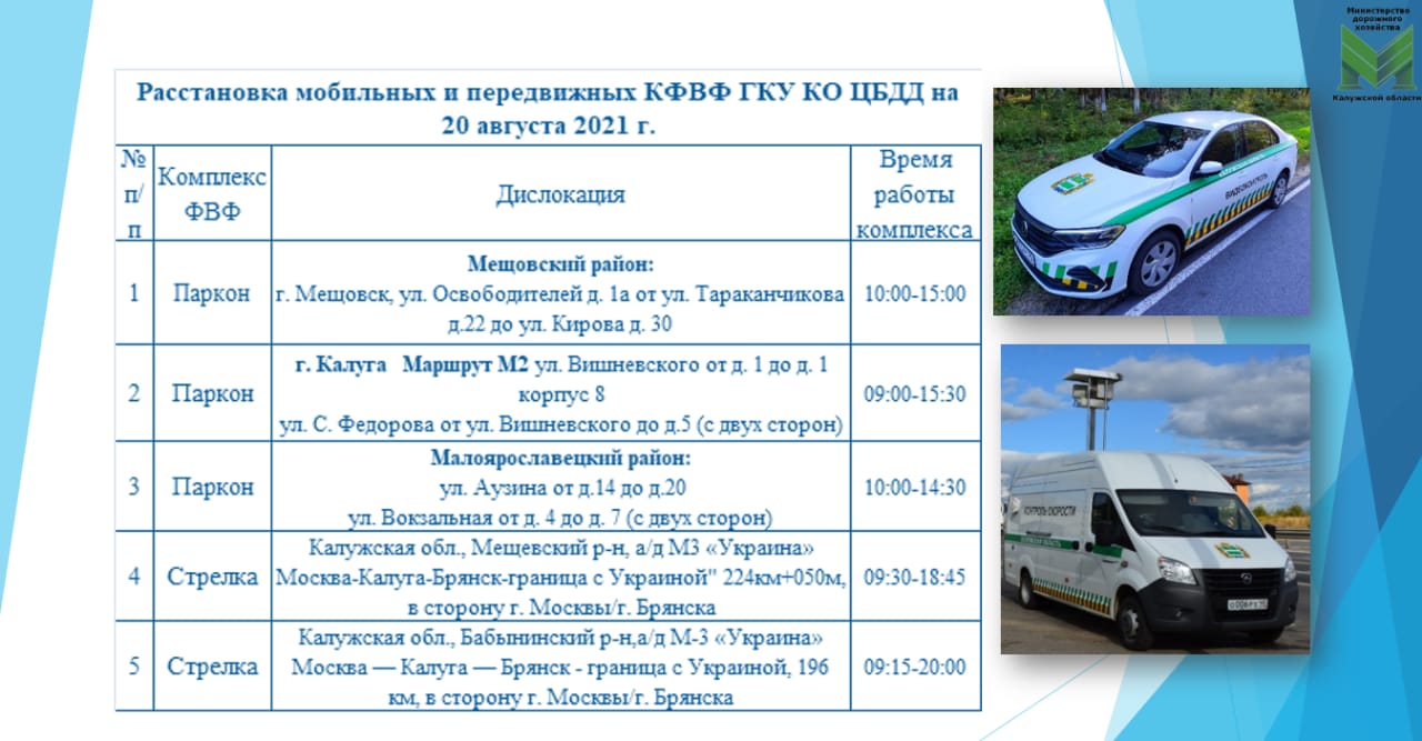В области видео и фото фиксация проходит в городе Мещовск на улице Освободителей и в городе Малоярославец на улицах Аузина и Вокзальная.