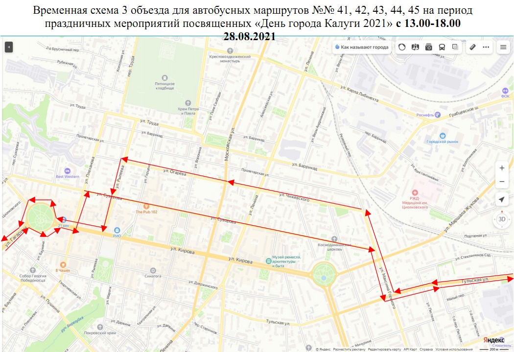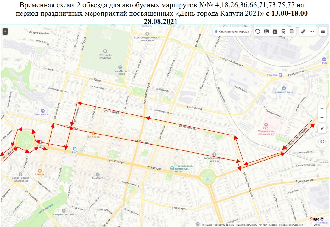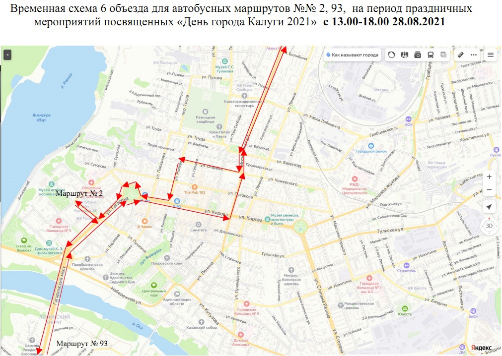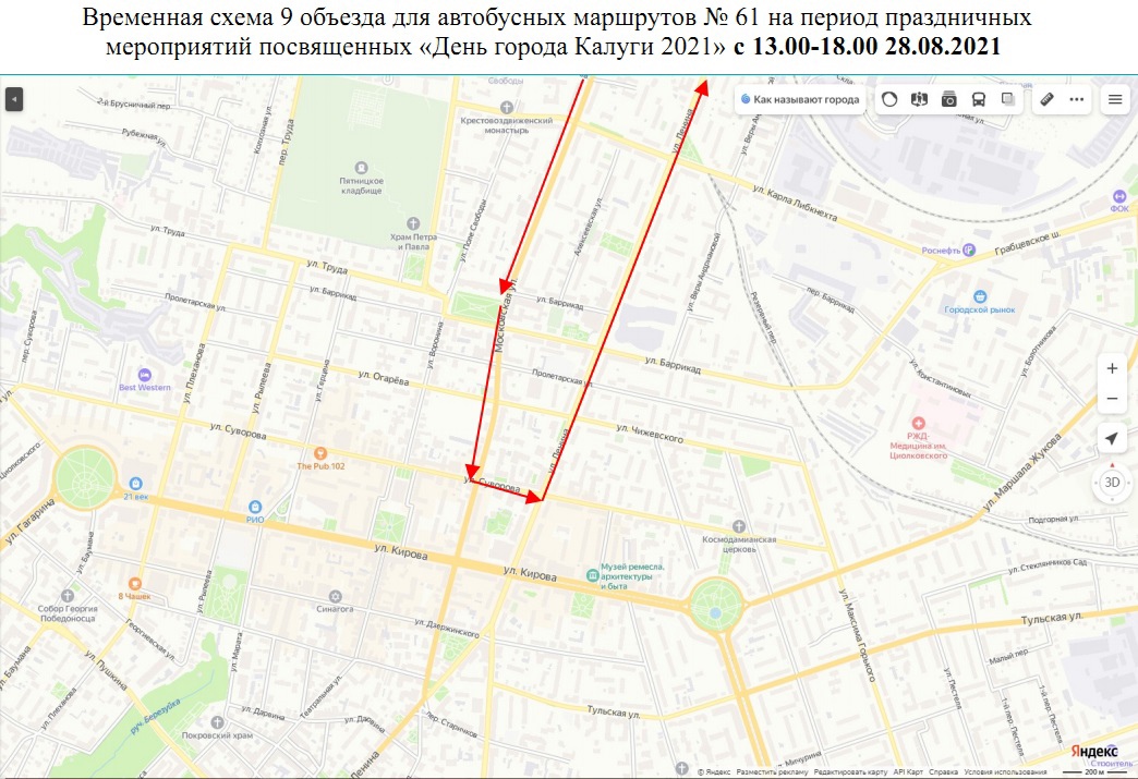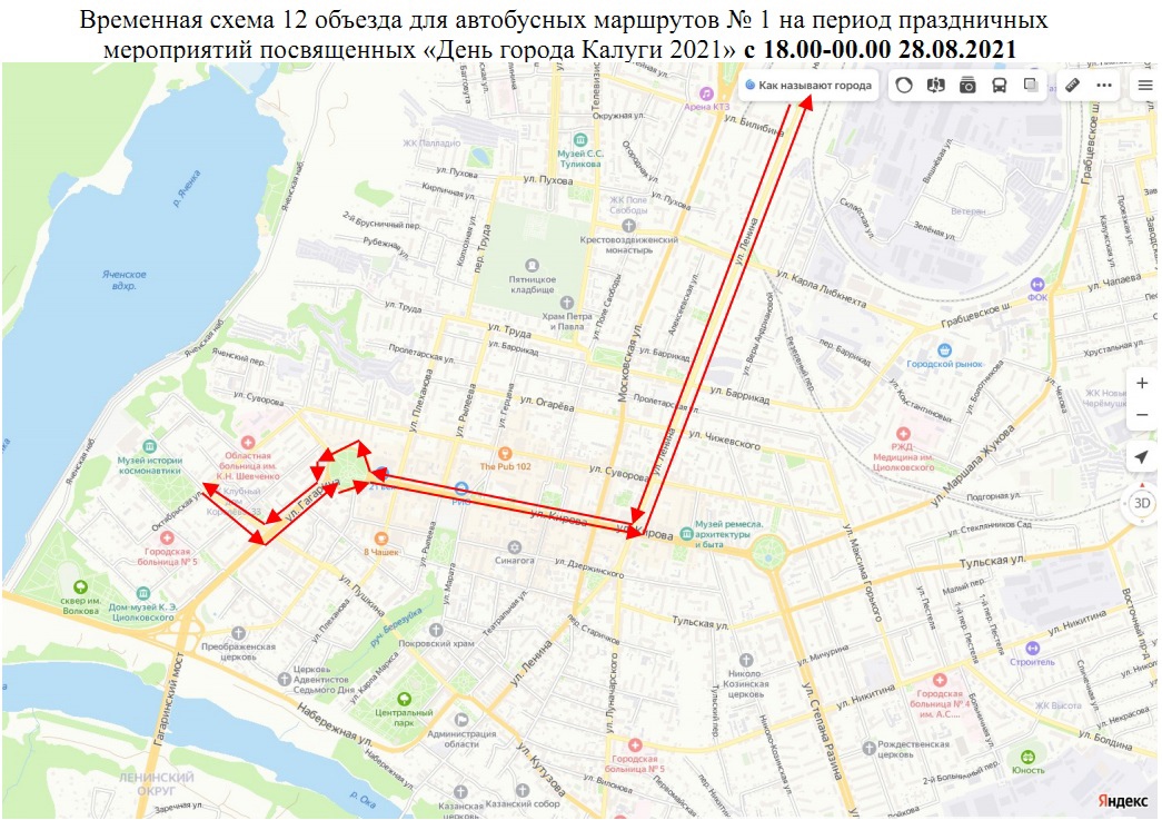 Также опубликованы схемы изменныненых маршрутов общественного тарнспорта Калуги на День города: