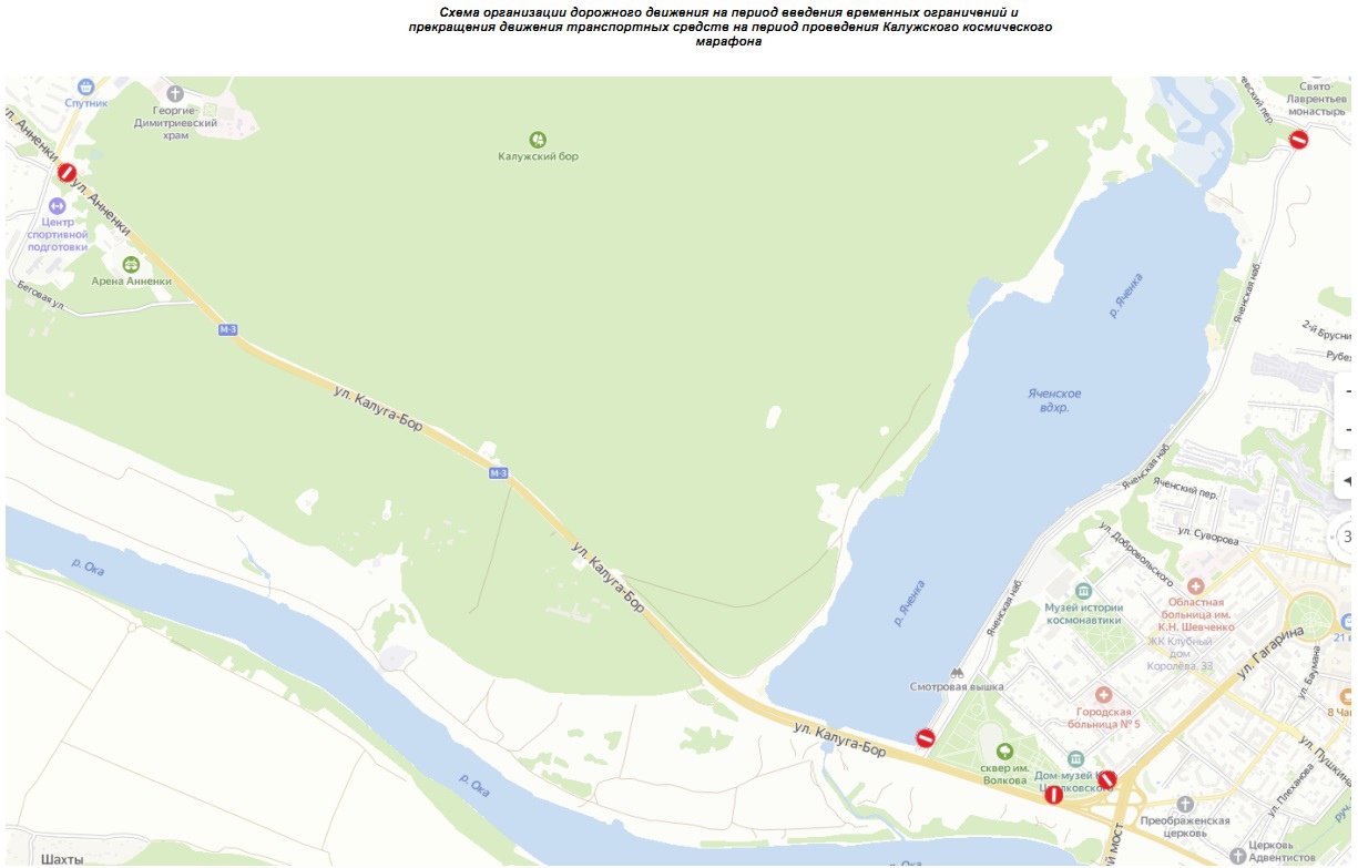- С 07:00 до 14:00 по ул. Калуга-Бор (от ул. Гагарина до автодороги «Москва-Бобруйск») на период проведения Калужского космического марафона.