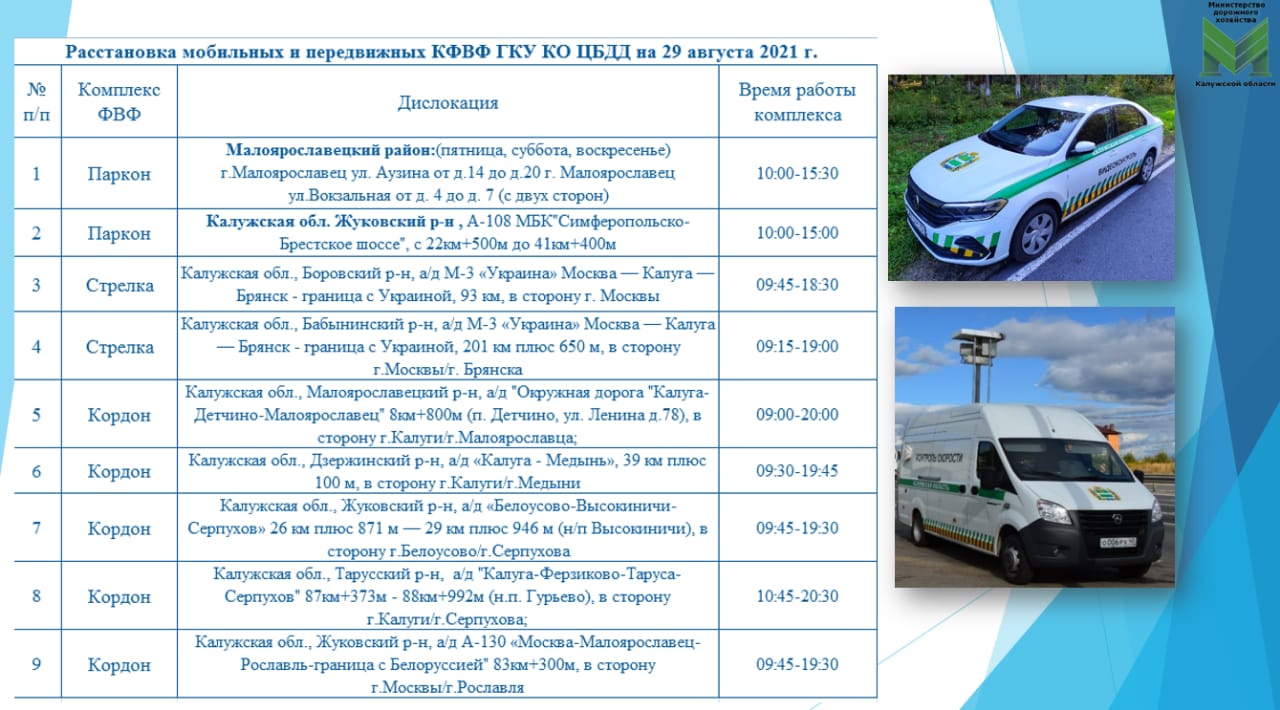 А также на трассе М-3 «Украина», на дорогах «Окружная дорога города Калуги», Калуга-Медынь, Симферопольско-Брестское шоссе, Белоусово-Высокиничи-Серпухов, Калуга-Ферзиково-Таруса-Серпухов, Москва-Малоярославец-Рославль–граница с Беларусью, в Малоярославецком, Тарусском, Дзержинском, Жуковском, Боровском и Бабынинском районах.