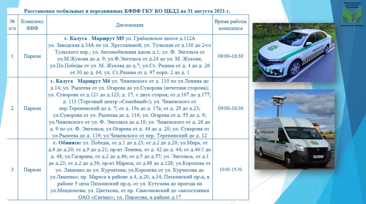 Во вторник, 31 августа, по данным «Центра безопасного дорожного движения», мобильные и передвижные камеры в Калуге можно будет встретить с 9:00 до 16:30.