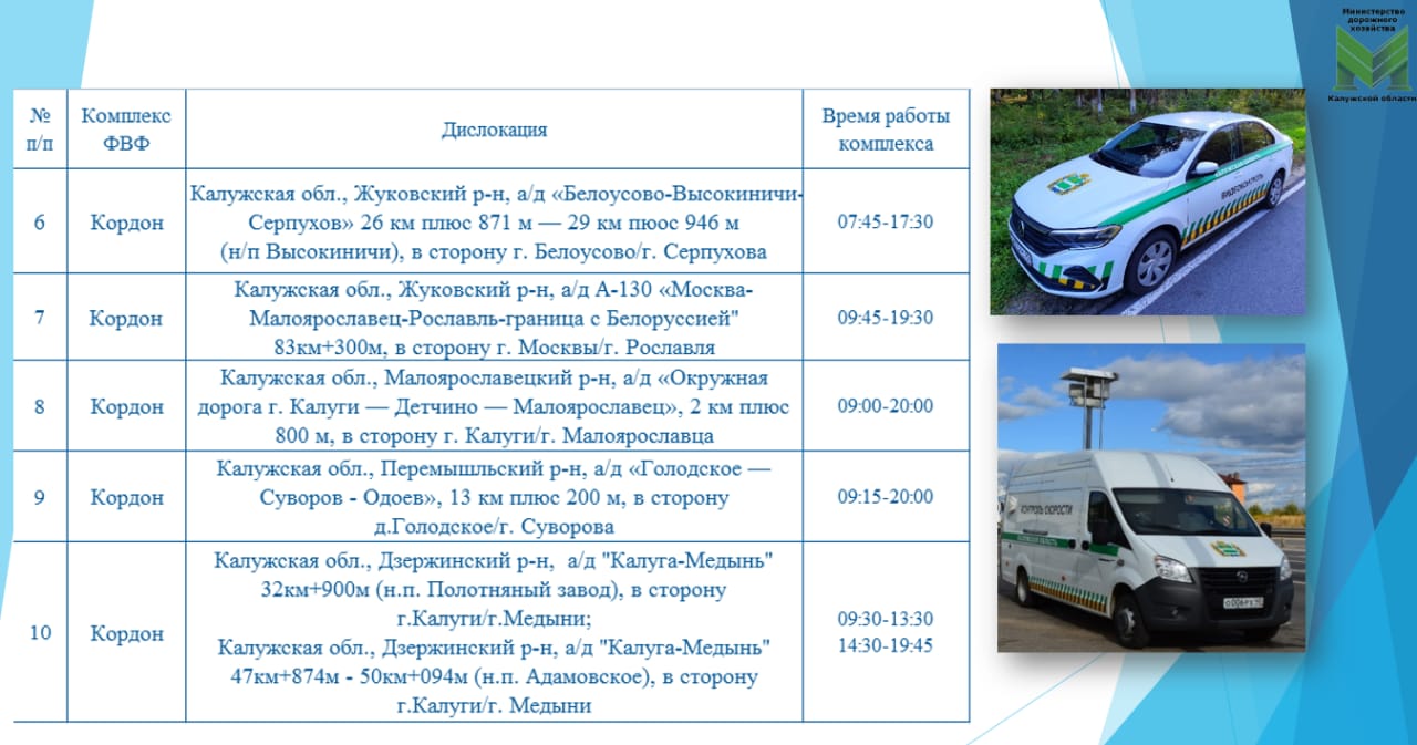 В области видео и фотофиксация проходит на трассе М-3 «Украина», автодорогах «Окружная дорога города Калуги», Голодское-Суворов-Одоев, Калуга-Медынь, Белоусово-Высокиничи-Серпухов, Москва-Малоярославец-Рославль–граница с Беларусью, в Малоярославецком, Перемышльском, Дзержинском, Жуковском, Мещевском и Бабынинском районах.