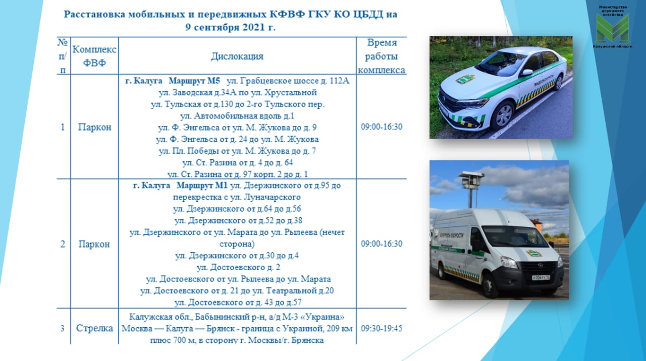 В четверг, 9 сентября, по данным «Центра безопасного дорожного движения», мобильные и передвижные камеры в Калуге можно будет встретить с 9:00 до 16:30.