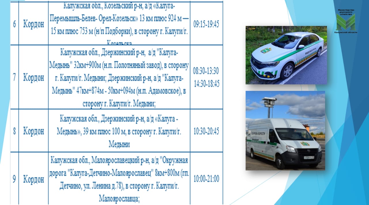 Также на трассе М-3 «Украина» и автодорогах «Окружная дорога города Калуги», Калуга-Медынь, Калуга-Перемышль-Белев-Орел-Козельск, Москва-Малоярославец-Рославль–граница с Беларусью, в Мещовском, Жуковском, Козельском и Дзержинском районах.