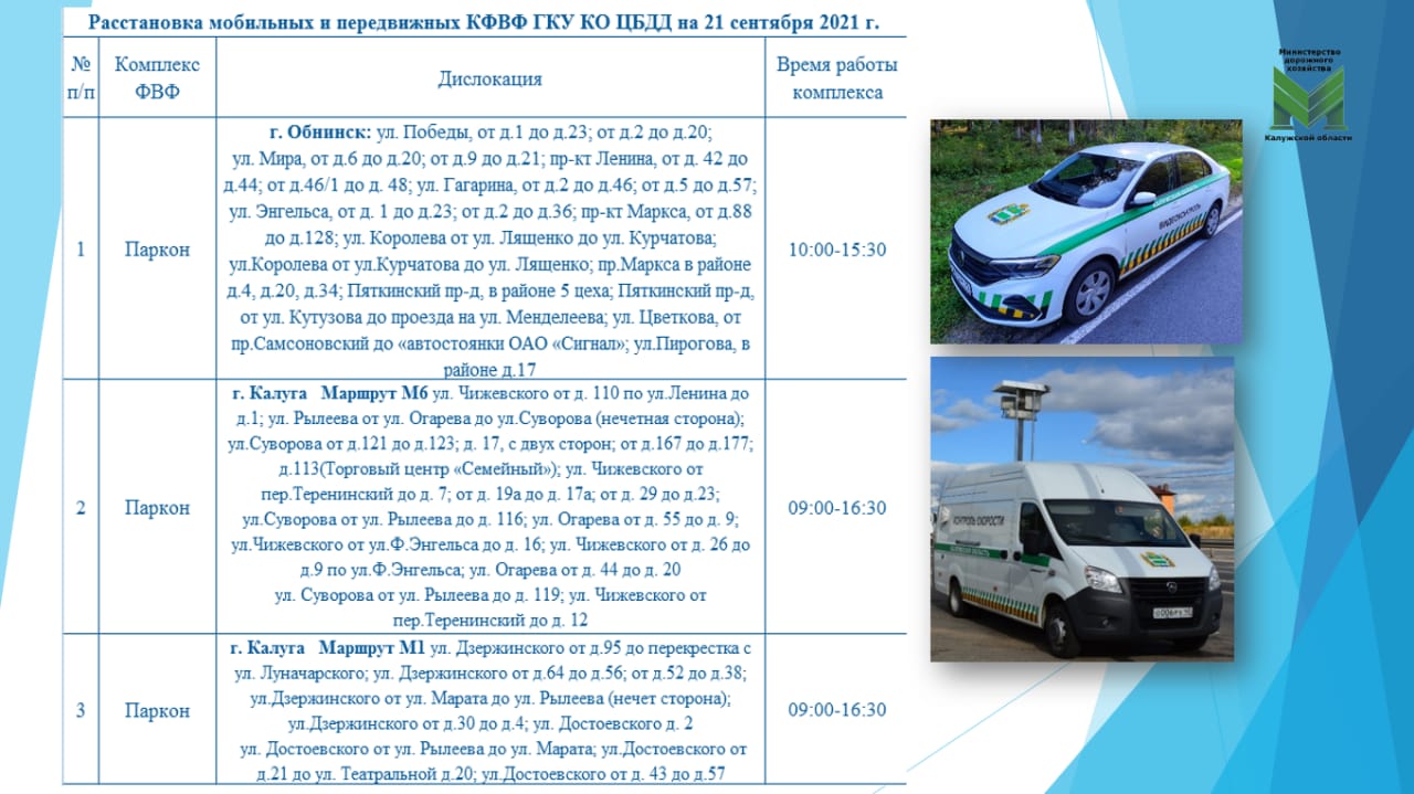 Во вторник, 21 сентября, по данным «Центра безопасности дорожного движения», мобильные и передвижные камеры в Калуге можно будет встретить с 9:00 до 16:30.