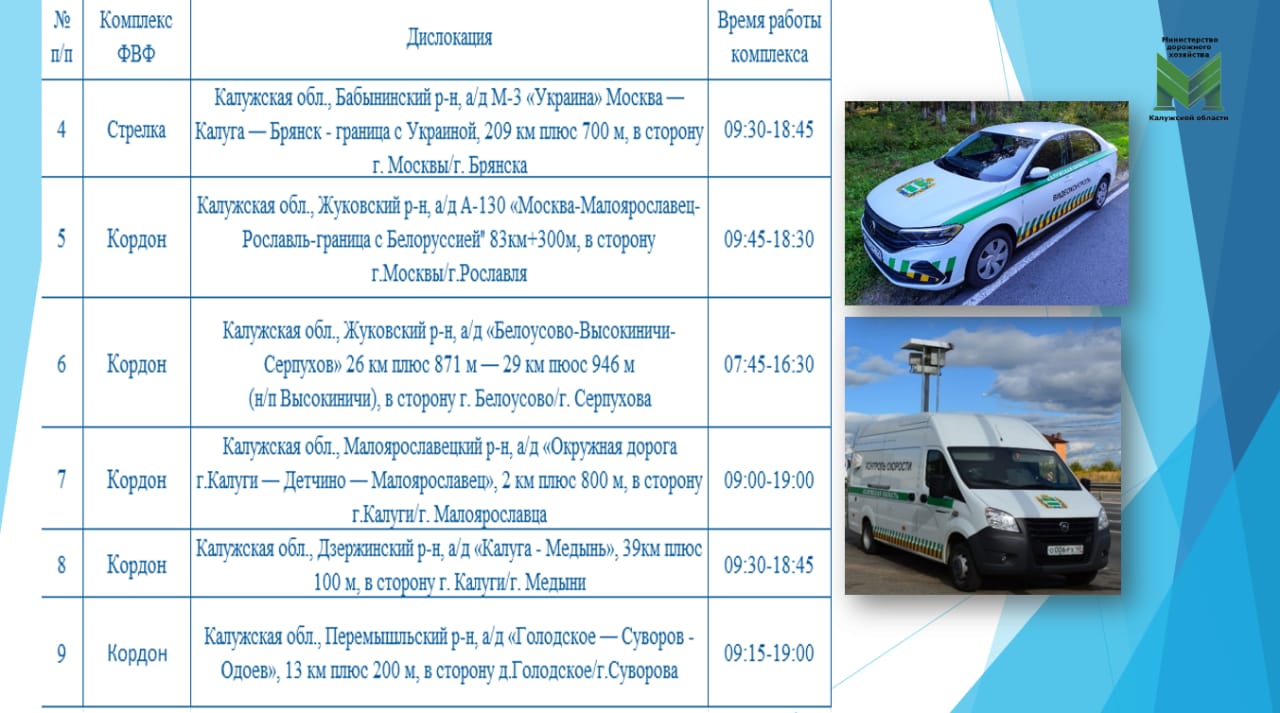 А также на трассе М-3 «Украина» и автодорогах «Окружная дорога города Калуги», Калуга-Медынь, Белоусово-Высокиничи-Серпухов, Голодское-Суворов-Одоев, Москва-Малоярославец-Рославль–граница с Беларусью, в Малоярославецком, Перемышльском, Жуковском, Дзержинском и Бабынинском районах.
