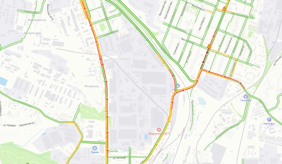 Как сообщают очевидцы, пробки в обе стороны возникли из-за того, что на железнодорожном переезде в районе улицы Поселковой сломался светофор. Там все время горит красный свет. В итоге все водители притормаживают, кто-то останавливается и ждет.